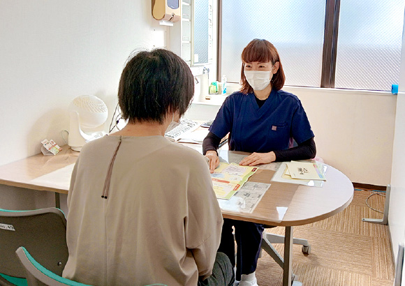 入退院支援センターでは、検査説明に加え、患者さんやご家族から入院前に情報を得て、安心して入院生活が送れるよう支援しています。また、継続看護の充実に向け、退院後を見据えて、入院や退院に関する相談や支援を地域連携室や病棟など他部門と連携しながら行っています。